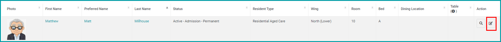 When in Residents, click on the Edit icon in the chosen Resident's Actions column.