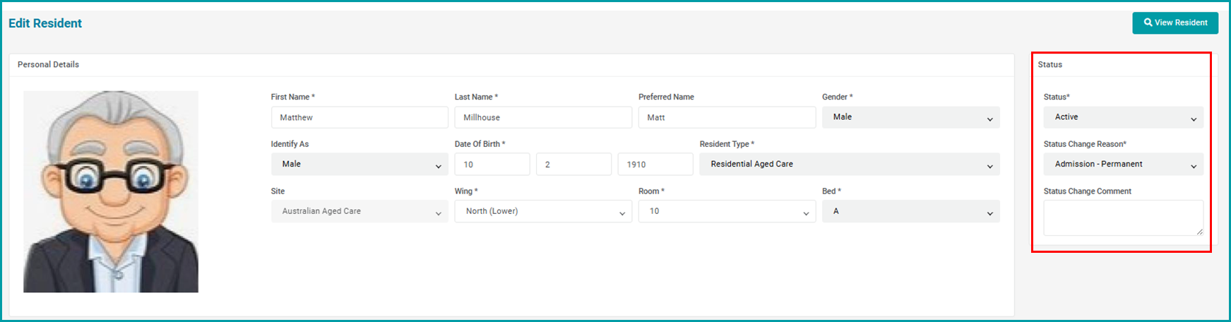 The Status box is to the right of the Edit Resident details:
