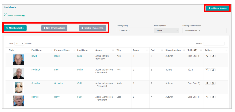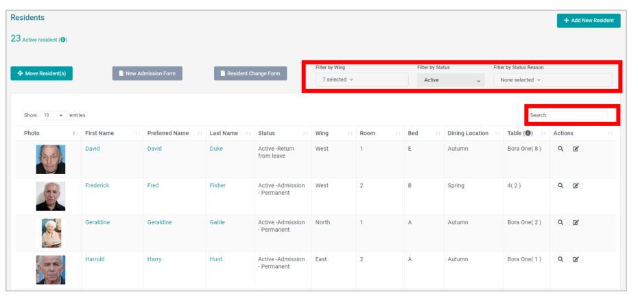 Residents can be filtered by Wing, by Status and by Status Reason. You can also search for a Resident using the Search field.