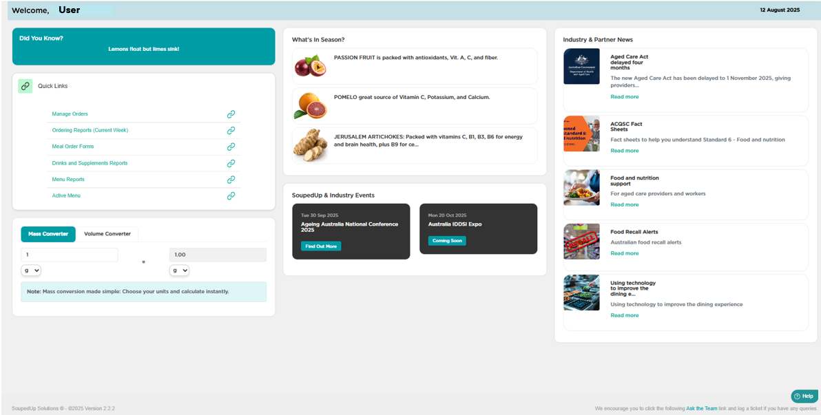 The Home page provides a space to keep our users up-to-date with what's in season, SoupedUp & Industry events, Industry & Partner News, fun facts and a mass conversion calculator.