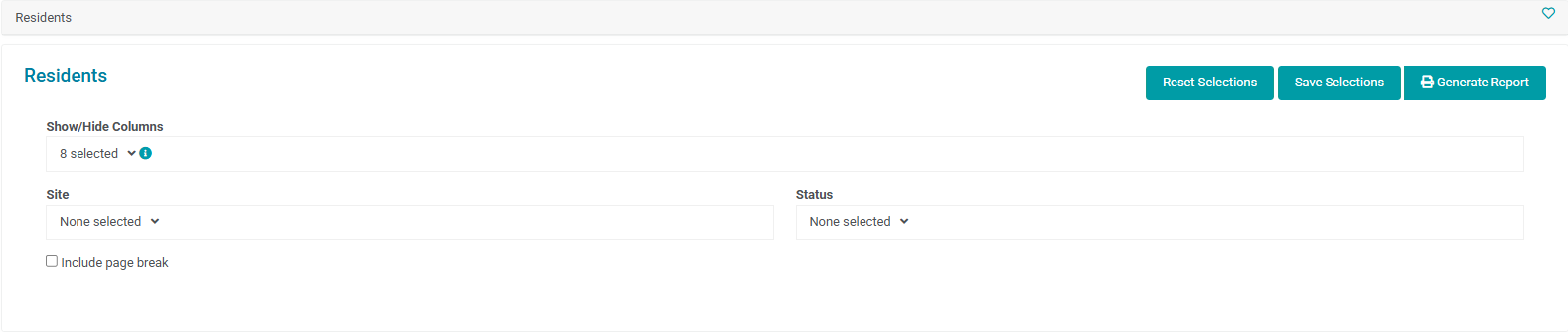 The Head Office Resident Report will allow you to generate a PDF file to save or print a list of all Residents within your Organisation Sites. You can also customise the Report by using filter options as per your preferences using the drop down selections for Show/Hide Columns, Site and Status and can choose to generate with page break.