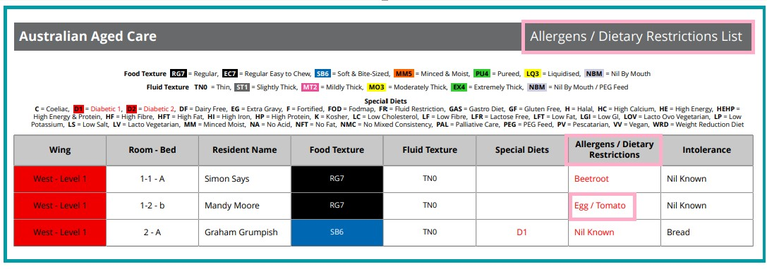 We have updated the way allergens and dietary restrictions display in the Allergens / Dietary Restrictions List. Now, if a resident has both allergens and dietary restrictions in their profile, these will be separated in the Allergens / Dietary Restrictions column in the report by a forward slash ( / ). The allergen ingredient will be listed first.